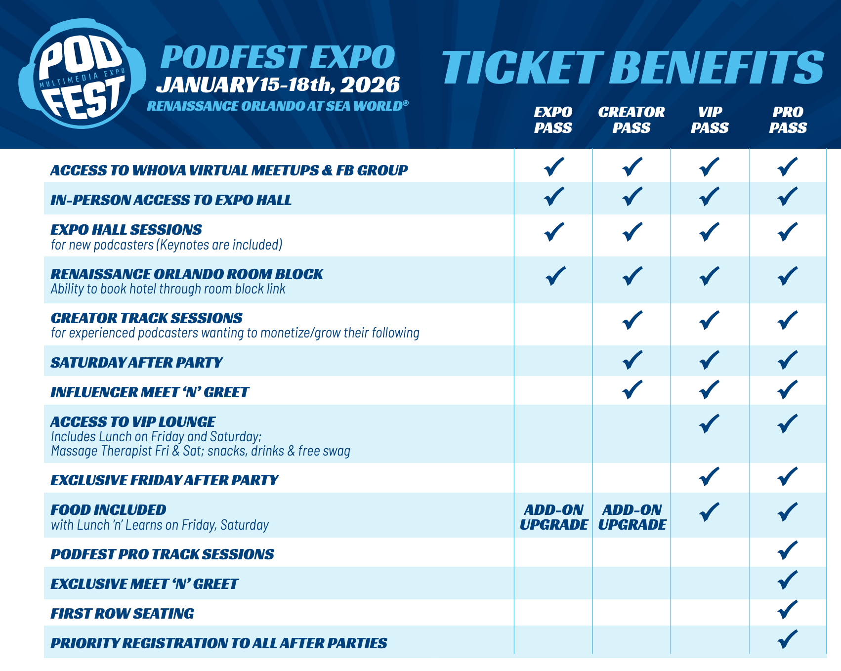 This VIP Experience is designed for experienced Podcasters and Creators who have a base level of knowledge and are looking for a more PREMIUM experience at Podfest with other VIP pass holders